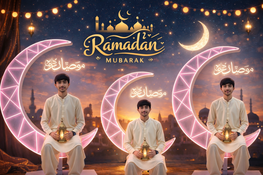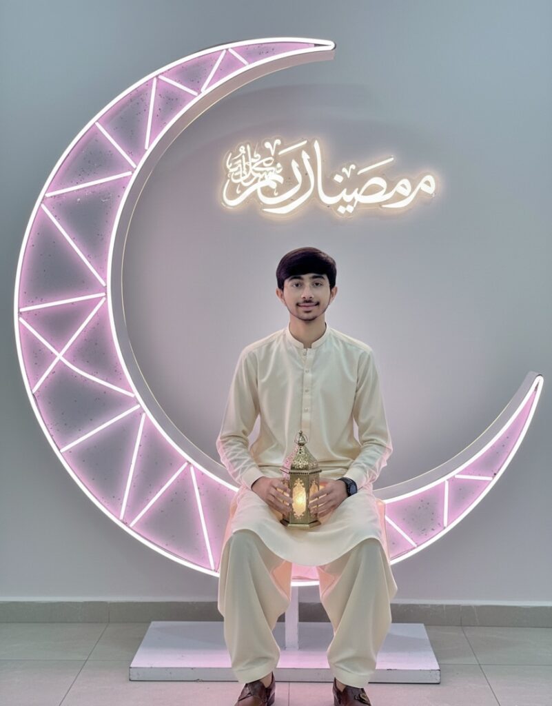 Create a super-realistic, ultra-sharp 16K image using my exact reference face without any alteration – facial structure, proportions, and expressions remain 100% unchanged. A slender 18-year-old boy sits gracetully inside a large illuminated crescent Decorative moon sculpture, adorned with soft neon-style lights. The composition is center-focused, balanced, and elegant. He is wearing a traditional loose full-pleated shalwar kameez in soft neutral tones, creating a clean and elegant appearance. He gently holds a lit Ramadan lantern, smiling softly and naturally while looking directly at the camera. The pose feels relaxed, calm, and refined. Face & skin details: Natural clean white skin tone Soft pinkish lips (natural) Realistic texture, no smoothing, no beautification Hair (if visible): glossy black hair with natural flow and movement, responding to gravity and motion, ultra-realistic shine Lighting & colors: Soft dreamy pink and white ambient lighting, smooth diffusion Cool-neutral highlights — no warm or golden light Subtle rim illumination around the silhouette for depth Colors rich but controlled, no oversaturation, premium cinematic realism Background: Minimalistic and aesthetic to enhance the crescent sculpture On the wall behind him, add the text/logo “رمضان المبارك” in elegant calligraphy Shallow depth of field, ultra-HD realism, luxury cinematic finishPeaceful, calm Ramadan mood.